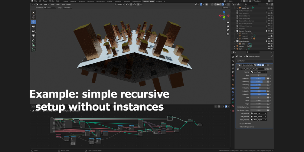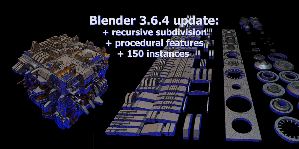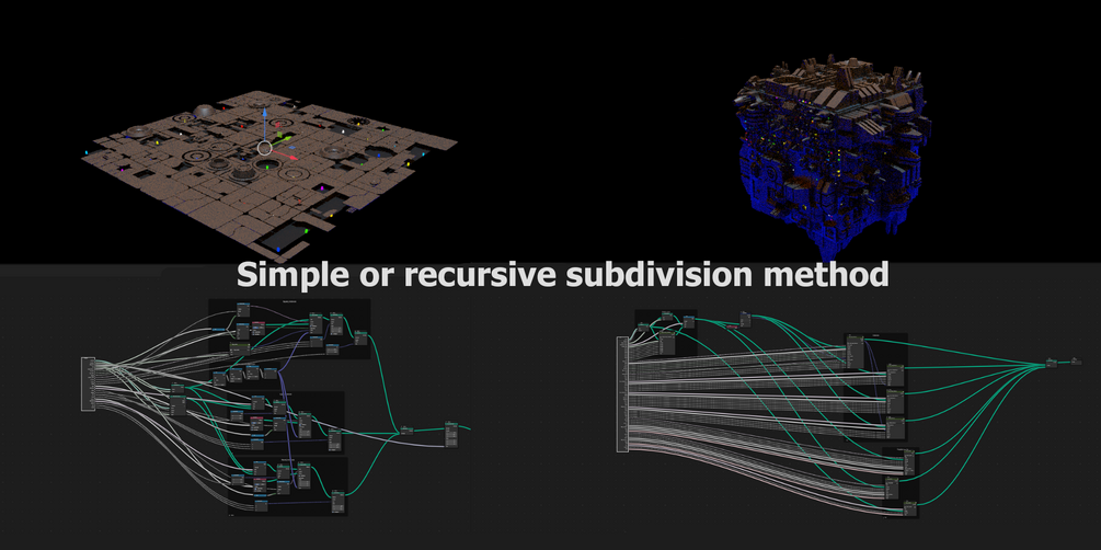 There are two main node setups: Scifi_Simple_Squares and Scifi_Recursive_Squares. The second being based on recursive subdivision, plus many options, while the first is based on simple subdisvision only. Simple is better for beginners to get familiar with this kind of node setup.